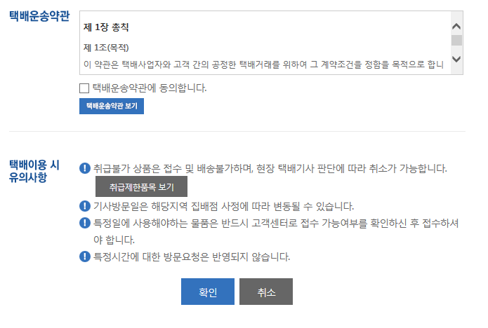 - 택배 운송 약관 동의에 체크하고 택배이용시 유의사항을 꼼꼼하게 읽어준 후, 확인을 눌러 한진택배 인터넷 접수를 마무리합니다.