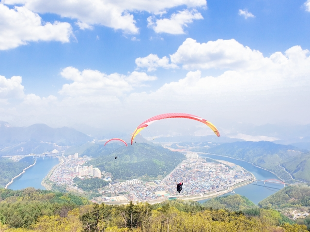 단양은 사계절 모두 멋진 경치를 감상할 수 있습니다. 특히, 페러글라이딩 체험을 할 수 있는 명소로 신선한 바람과 알록달록 예쁜 꽃과 나무들이 많은 봄, 가을에 많이 찾습니다.
