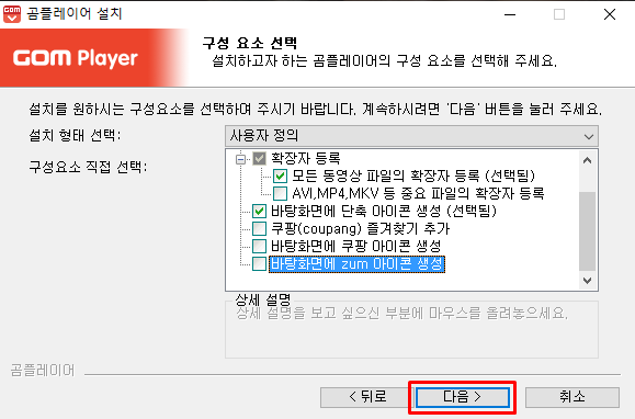 Step3. 구성요소선택에서 쿠팡, zum 아이콘 생성이 필요없으면 체크해제하고, [다음] 을 클릭합니다.