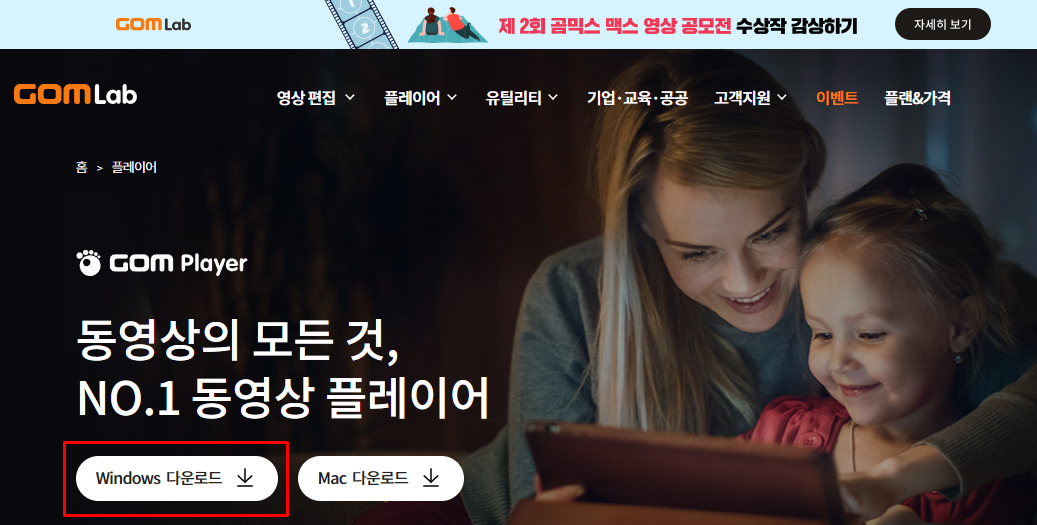 Step1. 곰플레이어 공식 홈페이지로 접속하여 [Windows 다운로드] 버튼을 클릭하여 다운로드받습니다.