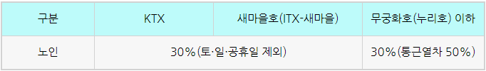 만 65세 이상대상 평일 기준 KTX, 새마을호(ITX-새마을), 무궁화호(누리로 이하) 30%할인, 무궁화 통근열차는 50%할인(주말 및 공휴일에는 할인 적용되지 않습니다.)