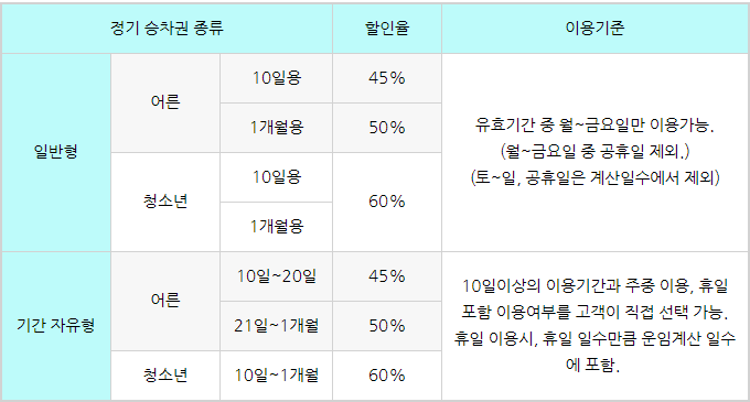 기차를 정기적으로 이용하는 분들을 위해 코레일에서는 정기승차권을 운영하고 있으며, 일반형과 기간 자유형으로 나눕니다.