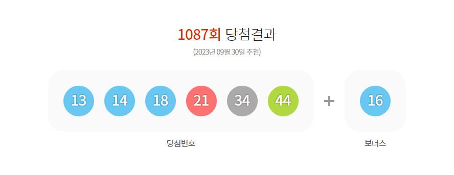 2023년 9월 30일자 1087회 로또당첨번호는 아래와 같습니다. 1등은 총 16명 나왔으며, 1인당 17억의 당첨금을 받았습니다. 여러분들도 아래의 당첨결과를 확인하시고 좋은 결과 있기 바랍니다.
