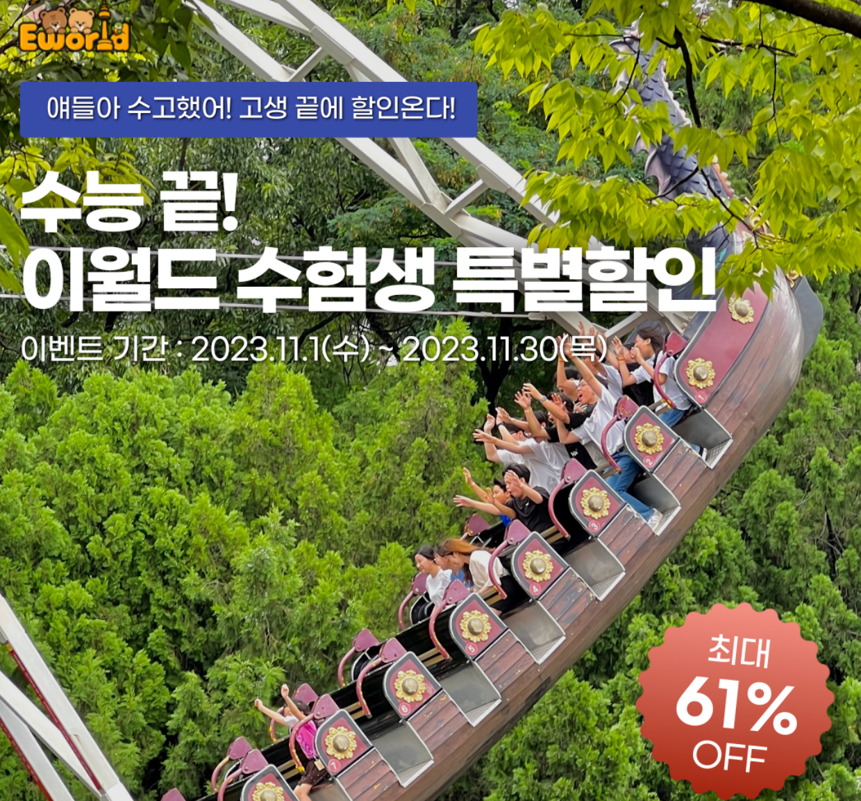 이월드는 11월 1일부터 11월 30일까지 고3수험생들을 대상으로 자유이용권 최대 61% 할인 이벤트를 진행합니다. 현장매표소에서 수험표나 학생증 등을 제시하면 종일권은 2만2900원, 야간권은 1만2900원에 구매 가능합니다. 홈페이지 예매 시 예매QR코드와 증빙서류를 입장시 제시하면 됩니다.