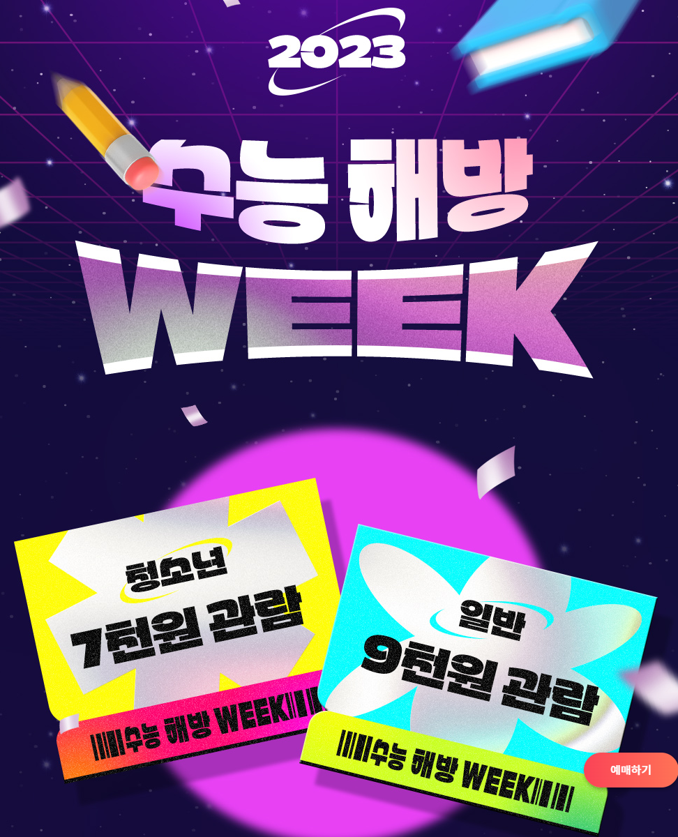 CGV는 수능을 맞아 ‘2023 수능 해방 WEEK’ 이벤트를 진행한다. 11월 15일부터 11월 21일까지 수험생과 청소년은 영화를 7,000원에 관람할 수 있습니다.