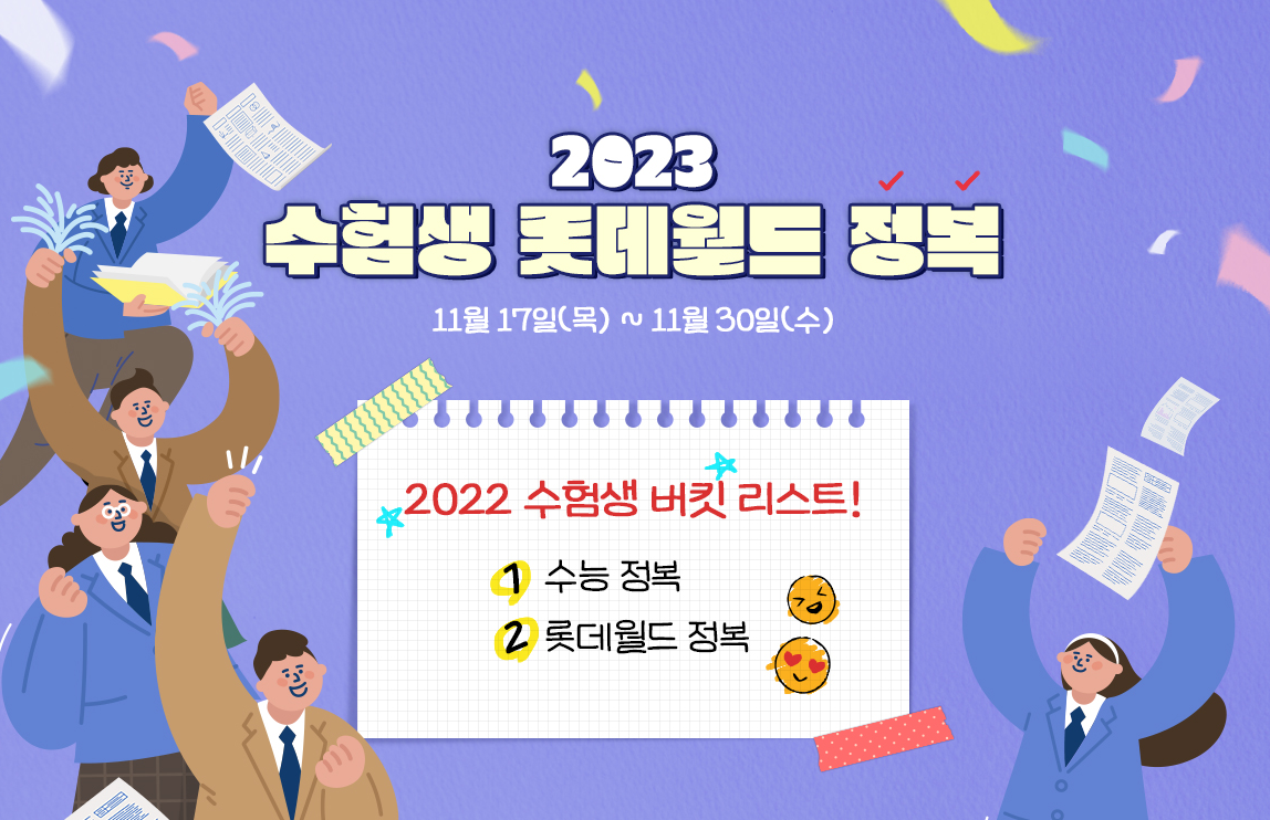 롯데월드는 11월 17일부터 11월 30일까지 수험생 롯데월드 정복 할인이벤트를 진행합니다.