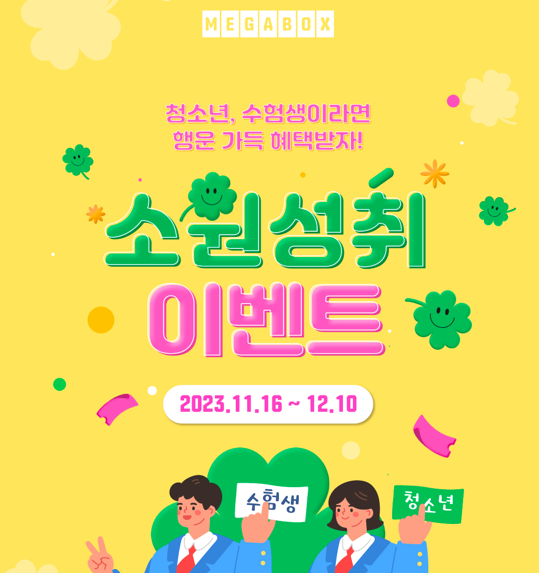메가박스는 16일부터 내달10일까지 수험생과 청소년을 대상으로 영화를 7,000원에 관람할 수 있는 할인혜택을 제공합니다. 홈페이지에서 쿠폰을 적용해 예매 가능하며 선착순 5000명에겐 팝콘 교환권도 제공됩니다. 또한 ‘WISH LIST’ 이벤트를 통해 다양한 경품도 제공합니다.
