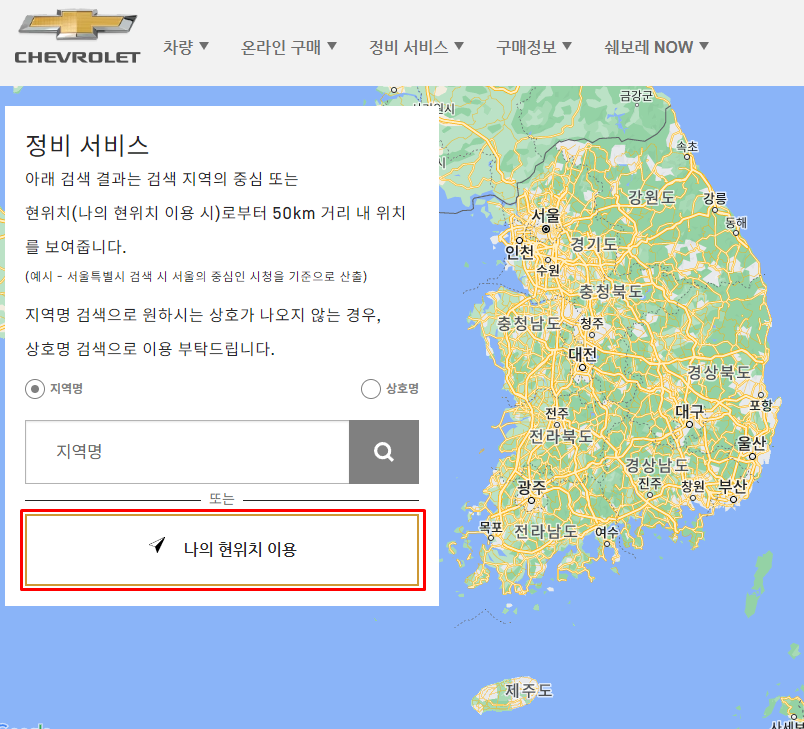 Step2. 정비 서비스 페이지에서 [나의 현위치 이용] 을 클릭합니다.