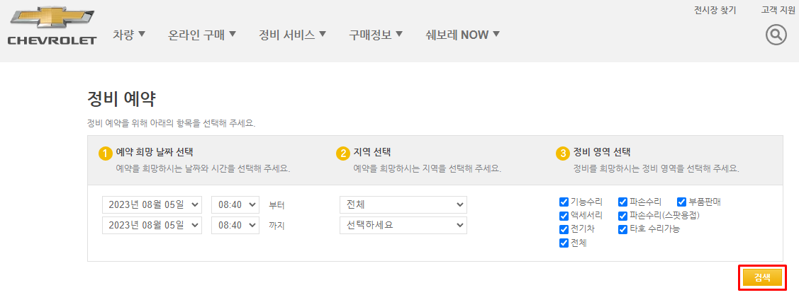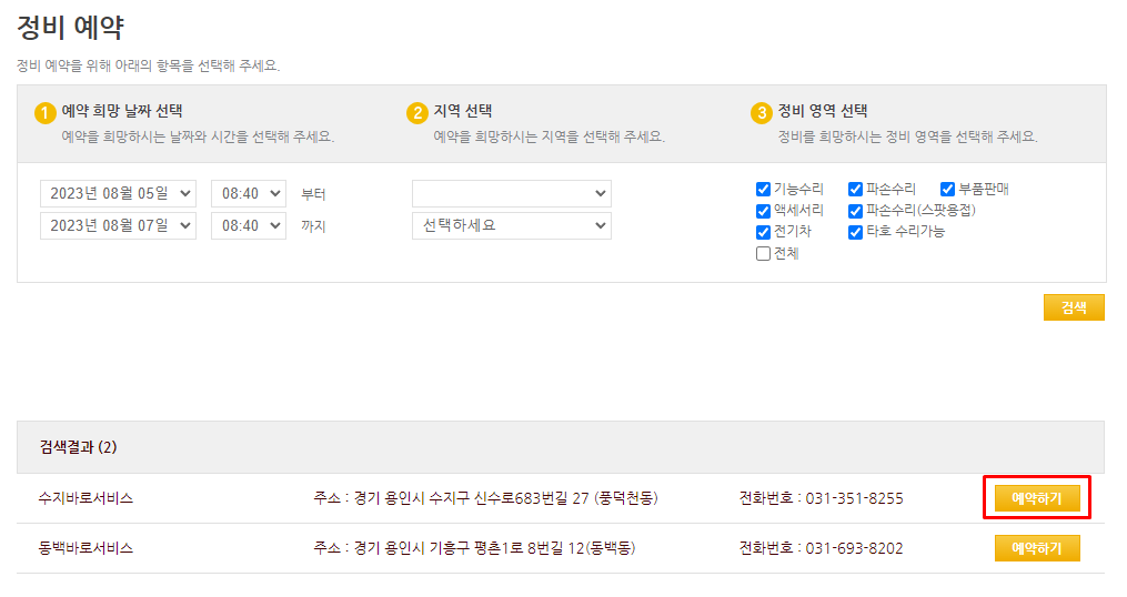 Step2. 정비예약 페이지에서 예약희망날짜, 지역, 정비영역을 선택 한 후 [검색]을 클릭하여 해당 서비스센터를 조회합니다.