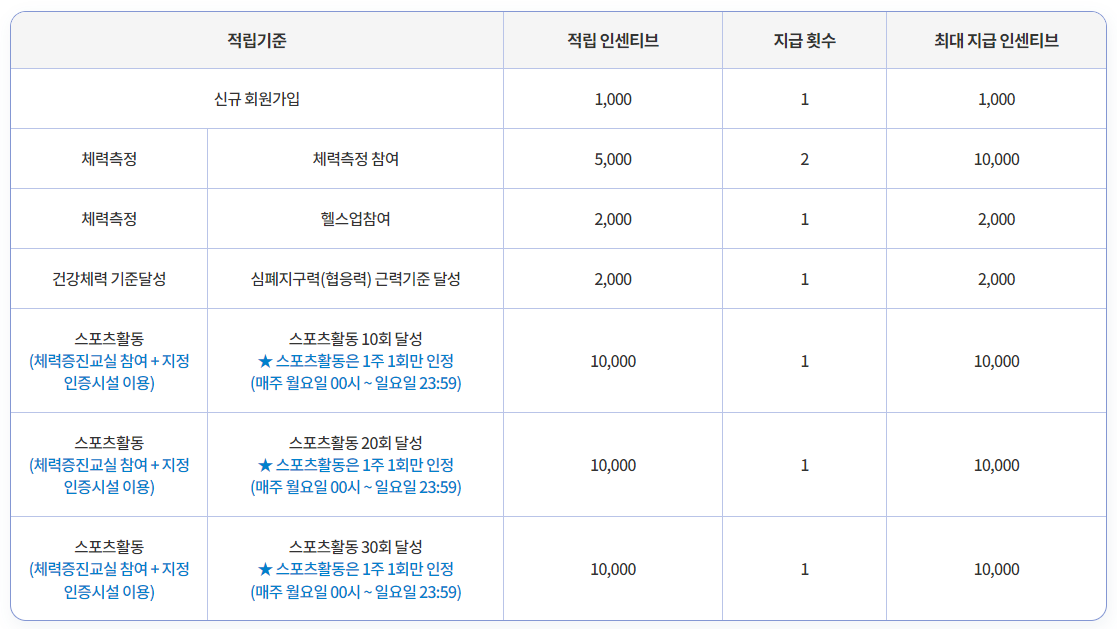 스포츠활동 인센티브는 연간 최대 50,000P 까지 적립 가능합니다. (전환은 10,000p 단위로 가능합니다.)