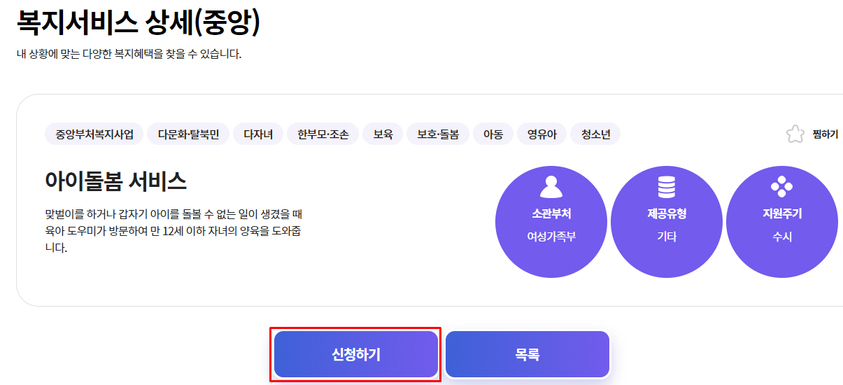 아이돌봄 서비스를 신청하려면 복지로 홈페이지를 통해서 신청가능합니다. 아래 링크를 통해서 신청하시기 바랍니다.
