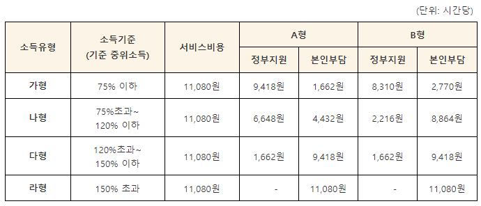 아이돌봄 서비스의 이용요금은 시간제서비스(기본/종합) 및 소득기준별 지원금액은 아래 표와 같습니다.