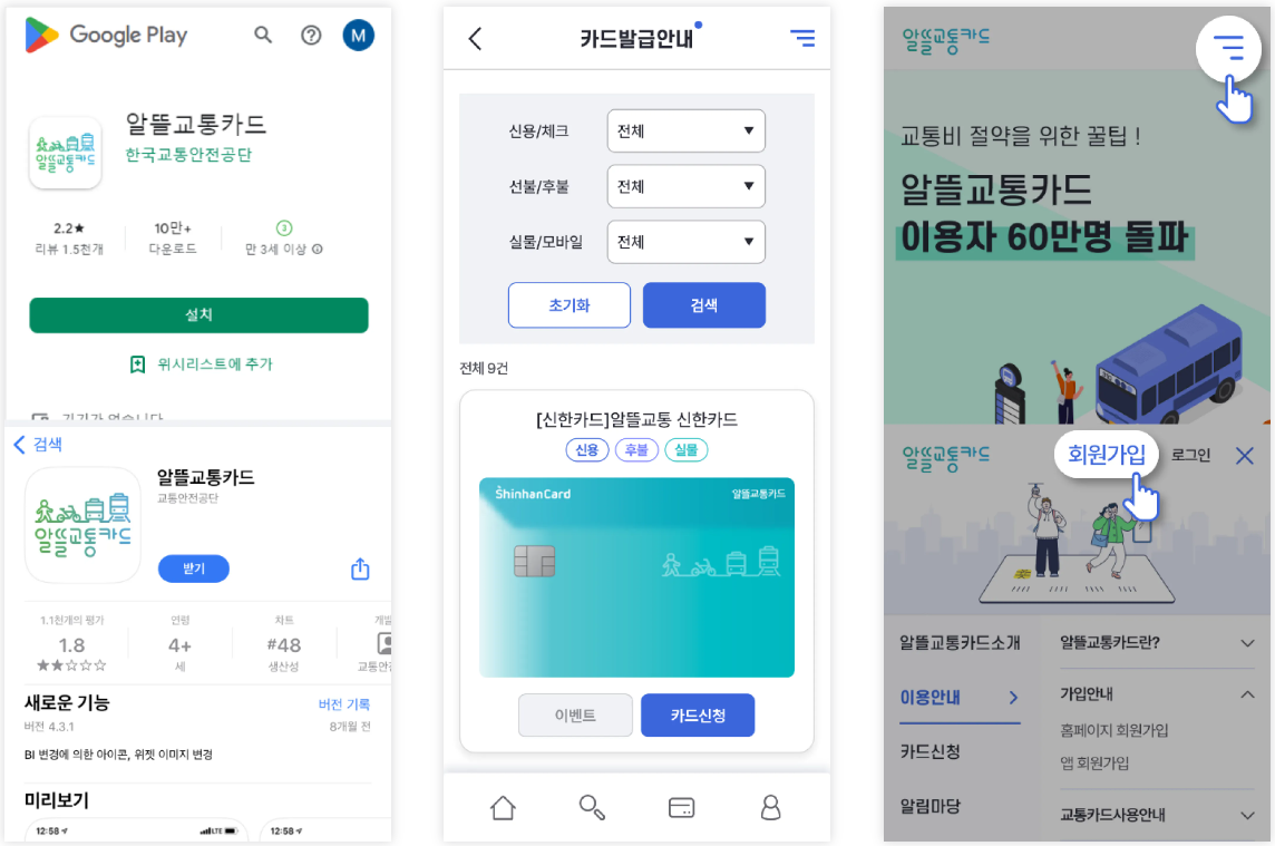 사전준비선불형 또는 후불형 알뜰교통카드 준비 회원가입 시 카드번호 16자리가 필요합니다