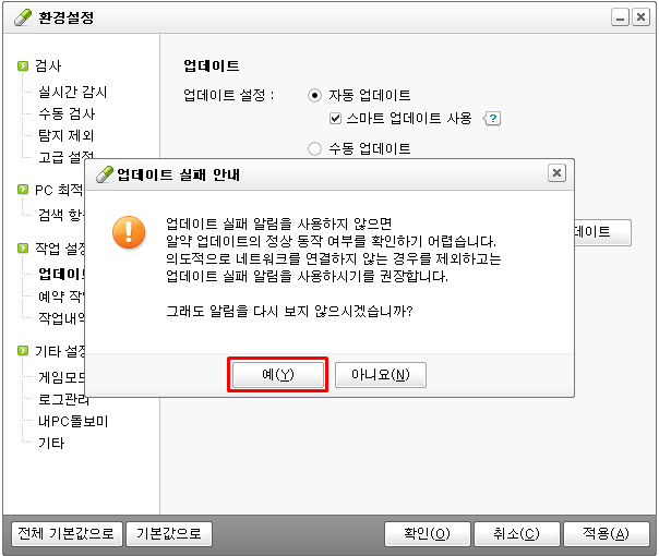 Step3. 업데이트 실패 안내 창이 나타나는데, [예]로 클릭합니다.