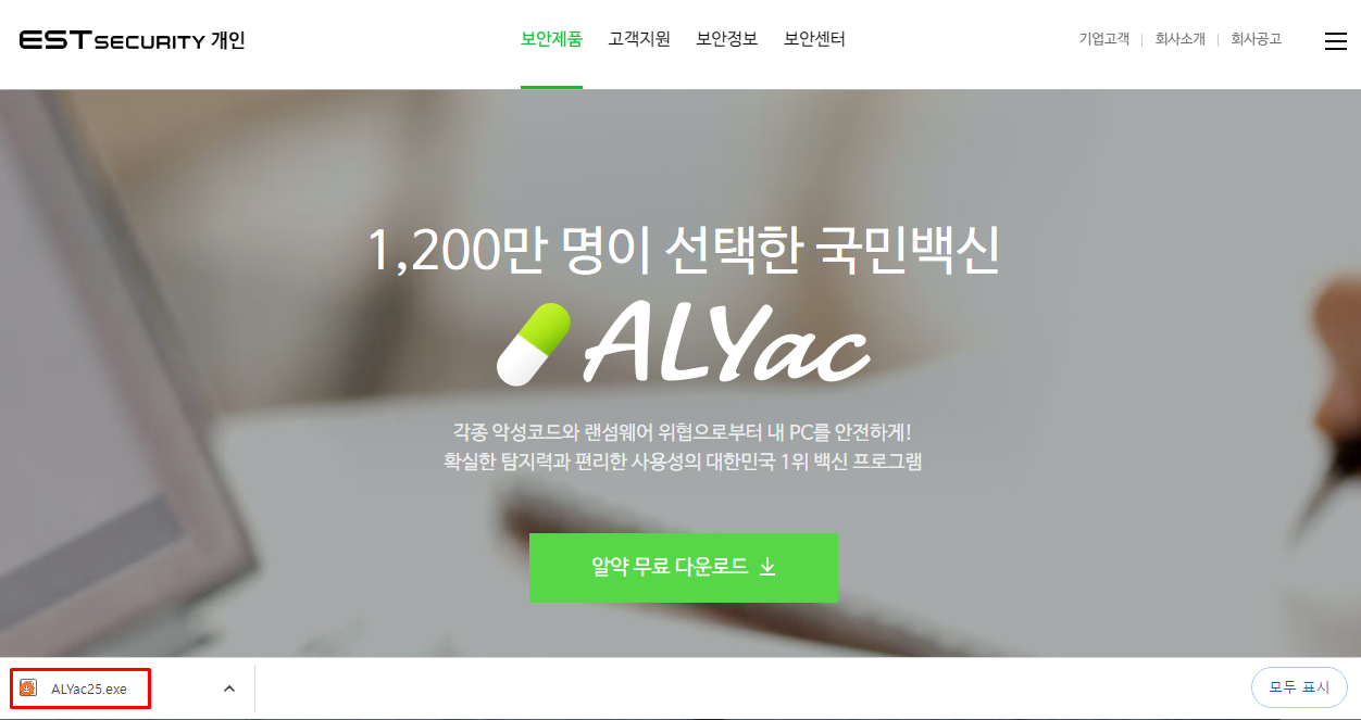 Step1. 알약 공식 홈페이지로 접속하여 [알약무료 다운로드] 버튼을 클릭합니다.