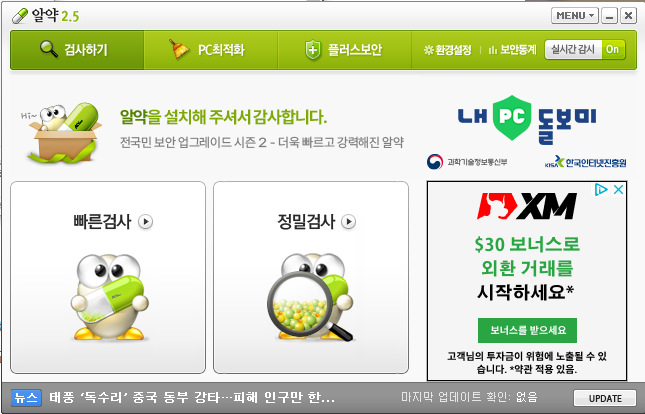 Step3. 이제 설치가 완료되면 알약 프로그램이 자동으로 실행됩니다. 간단히 검사하려면 '빠른검사'를 하고 상세히 검사하려면 '정밀검사'를 클릭해서 진행하시면 됩니다.