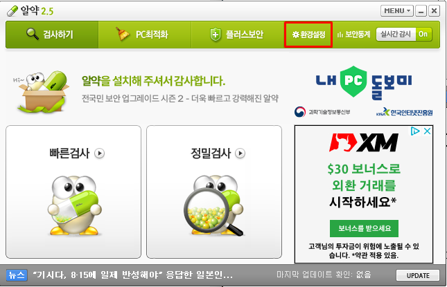 Step1. 알약 실행창에서 우측 상단의 [환경설정]을 클릭합니다.