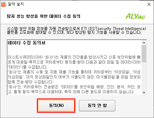 Step1. 설치파일을 실행하면 설치팝업창 띄고, 라이선스 계약 및 데이터 수집 동의 버튼을 클릭합니다.