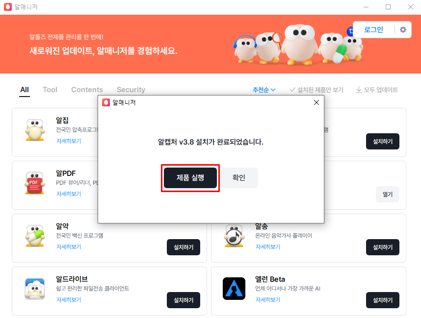 Step3 알캡처 설치가 완료되어 [제품실행] 을 클릭하여 프로그램을 실행합니다.