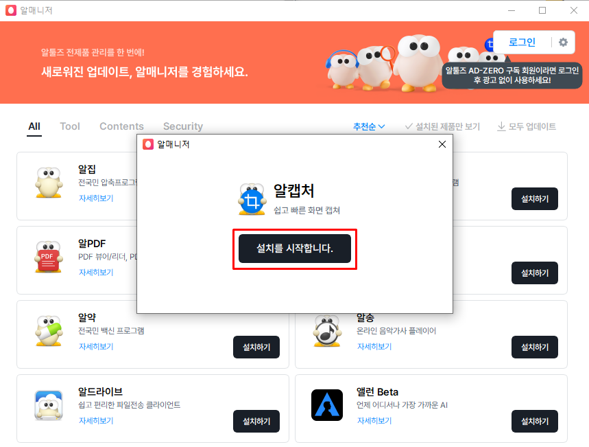 Step2 알캡처 설치화면에서 [설치를 시작합니다.] 를 클릭합니다.
