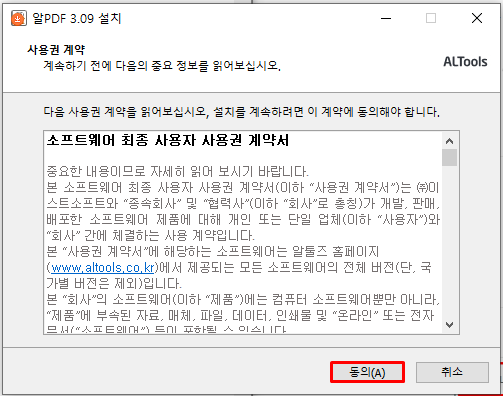Step1. 다운받은 설치파일을 실행해서 [동의] 버튼을 클릭합니다.