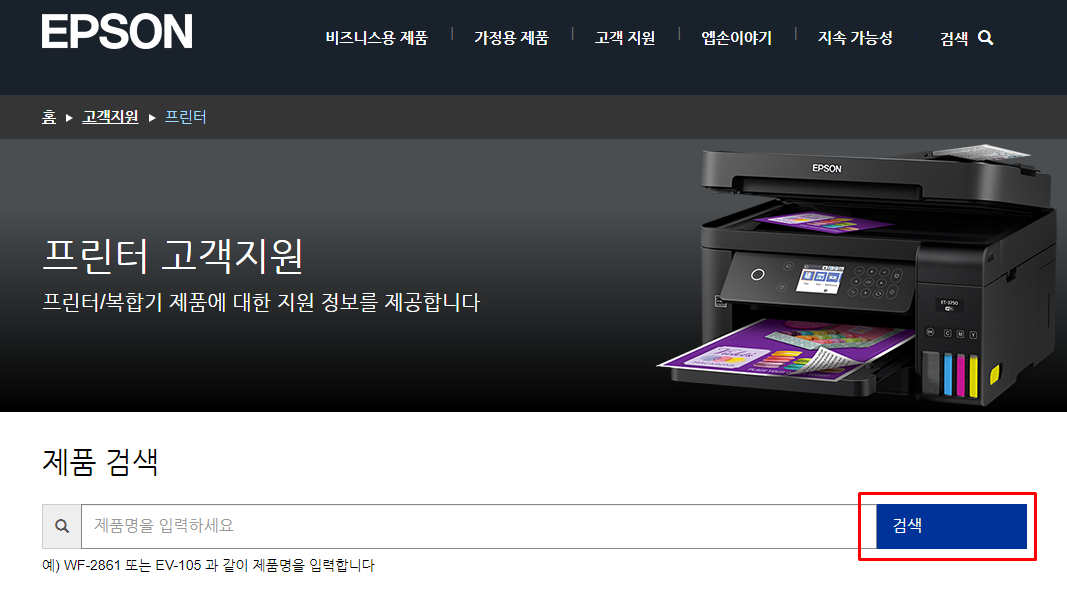Step2. 프린터 고객지원 페이지에서 해당 프린터 제품명을 입력한 후 [검색]을 클릭하여 조회합니다.