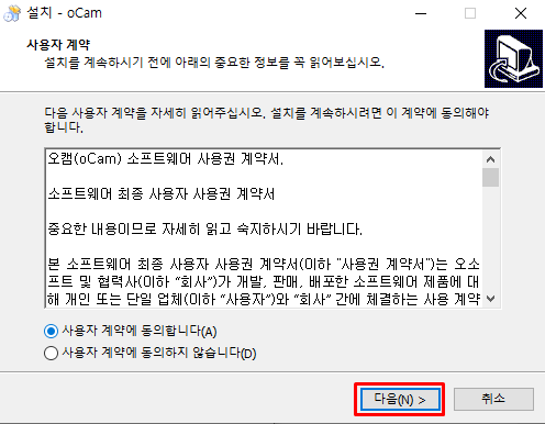 Step1 다운받은 설치파일을 실행하여 사용자 계약 동의 체크 후 [다음] 을 클릭합니다.