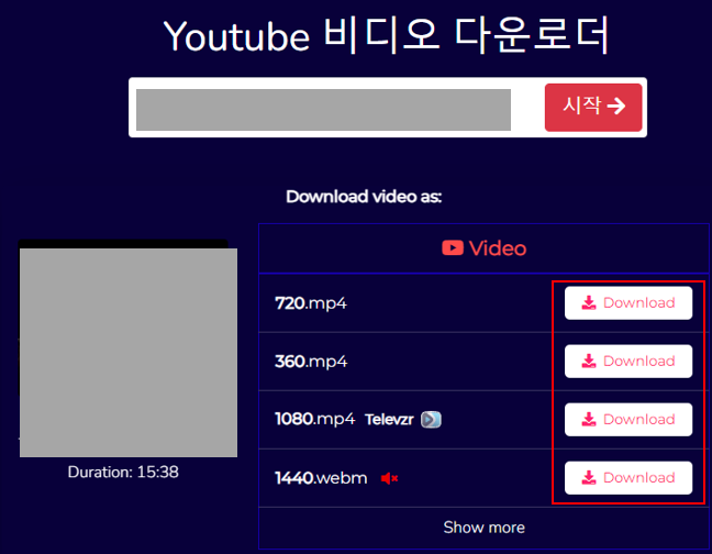 Step2. 다운받을 동영상 링크를 검색창에 넣고 [시작]을 누르면 다운로드 버튼이 생겨서 받을 수 있습니다.