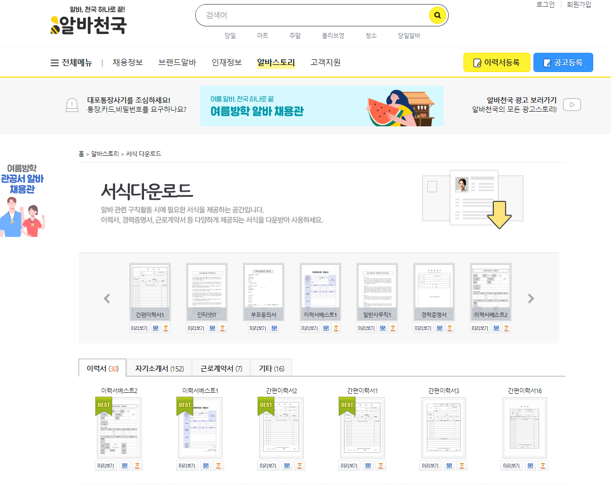 알바 전문 사이트인 알바천국에서도 이력서 양식을 다운로드 받을 수 있습니다. 아르바이트 이력서를 위해 다운로드 받으시려면 좋은 양식이 많이 있으니 확인해보시기 바랍니다.