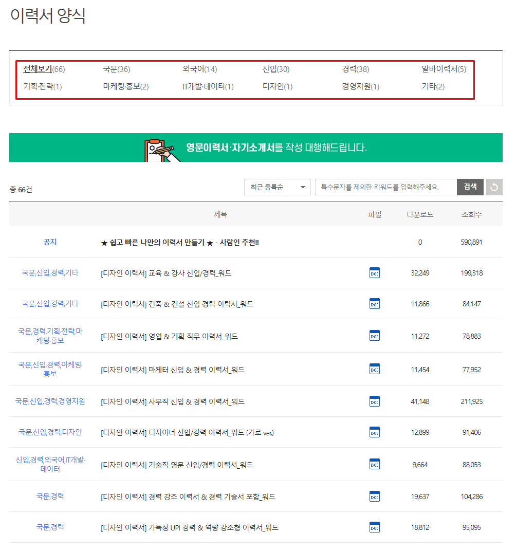 취업포털사이트로 유명한 사람인에서도 이력서 양식을 다운로드 받을 수 있습니다. 국문, 영문, 신입, 경력, 알바 등 다양한 이력서를 카테고리별로 분류해서 찾기 쉽게 했습니다.
