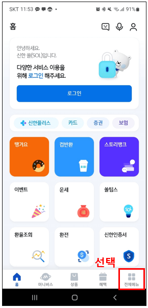 모바일 앱에서 로그인해서 우측하단의 [전체메뉴]를 선택합니다.