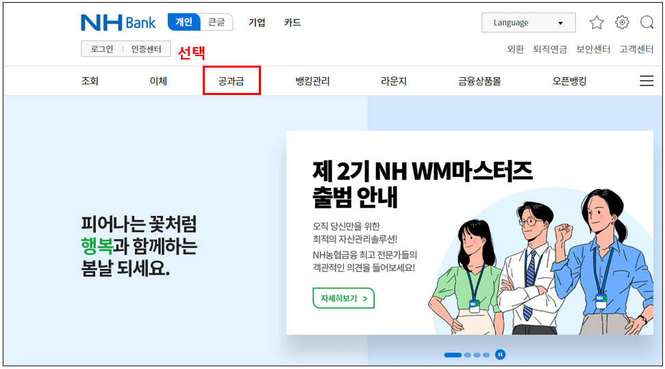 농협은행 인터넷뱅킹 홈페이지에 접속해서 상단메뉴 [공과금]을 클릭합니다.
