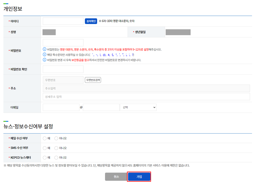 Step4. 개인 회원가입에서 약관동의 및 개인정보 입력 후 [가입] 버튼을 클릭합니다.