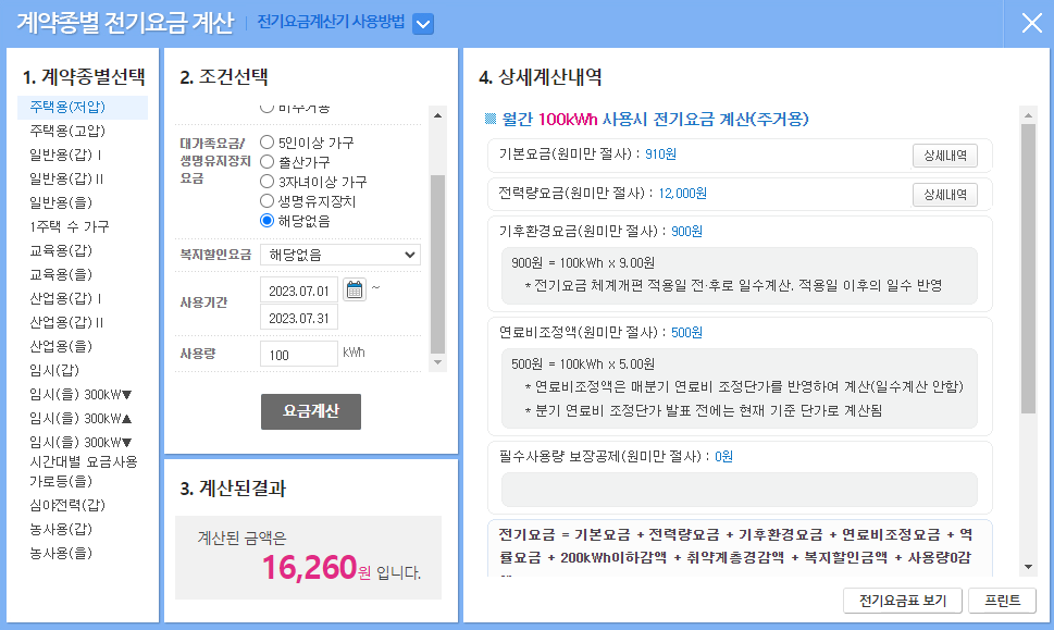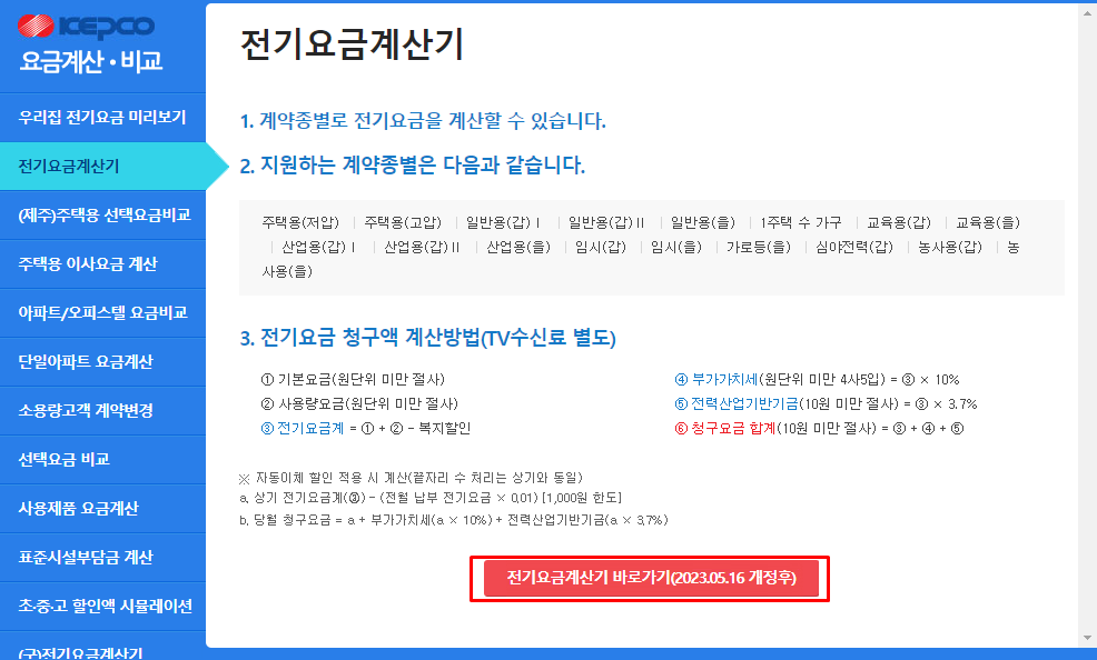 아래 화면의 [전기요금계산기바로가기] 버튼으로 이동 후 계약종별과, 조건을 선택하고 전력량을 입력하면 전기요금이 계산됩니다.