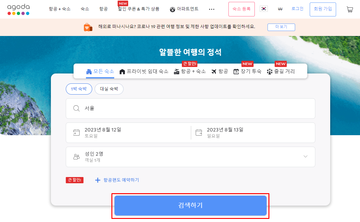 아래 이미지처럼 숙박위치, 체크인/아웃 일자, 인원수를 입력하고 [검색]을 클릭하면 저렴하고 좋은 숙박시설이 조회됩니다.