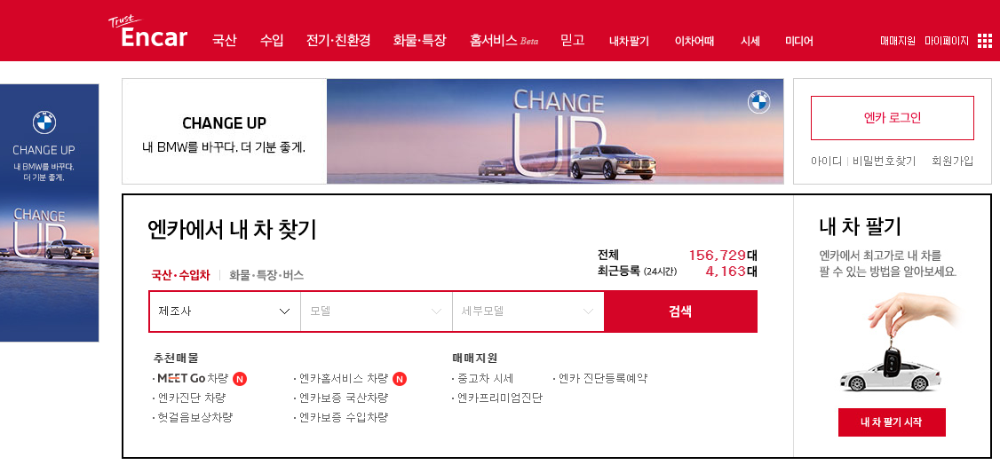 엔카는 국내 최대 중고차 매매사이트입니다. 15만 6천대 정도의 중고차를 보유하고 있으며, 많은 거래가 되고 있는 대중차의 등록대수가 많아 원하는 모델의 시세를 빨리 확인이 가능합니다.