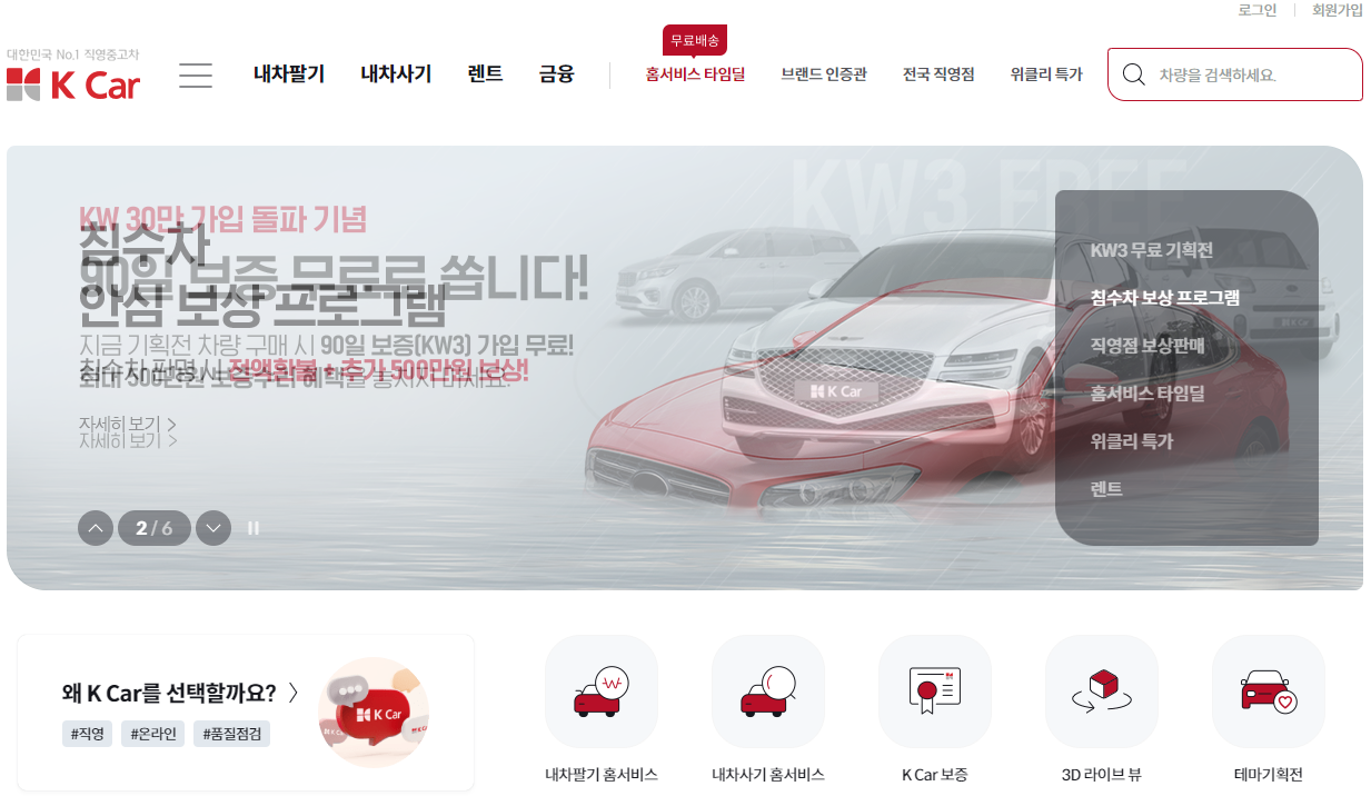 K카는 직접 중고차를 구매하여 수리와 정비를 한 후 소비자에게 판매하는 중고차 사이트입니다. 따라서 허위매물은 존재하지 않는 특징이 있습니다. 그래서 다른 매매사이트보다 높은 가격대에 형성되어 있습니다.