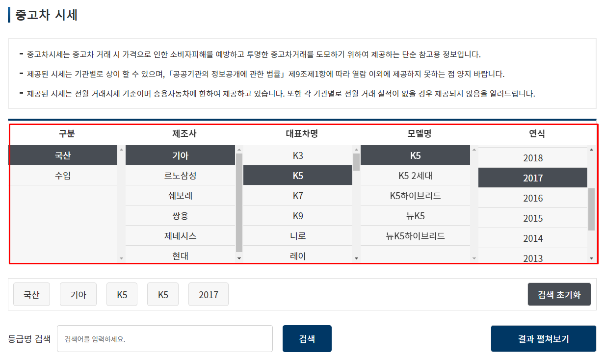 Step2 중고차 시세페이지에서 구분, 제조사, 대표차명, 모델명, 연식을 선택 후 [검색] 을 클릭합니다.