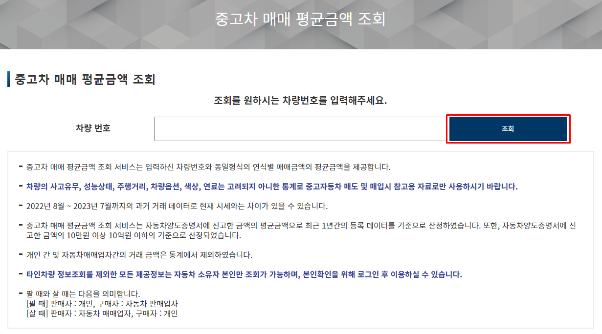 중고차 매매 평균금액 조회 서비스는 입력한 차량번호와 동일형식의 연식별 매매금액의 평균금액을 제공합니다.