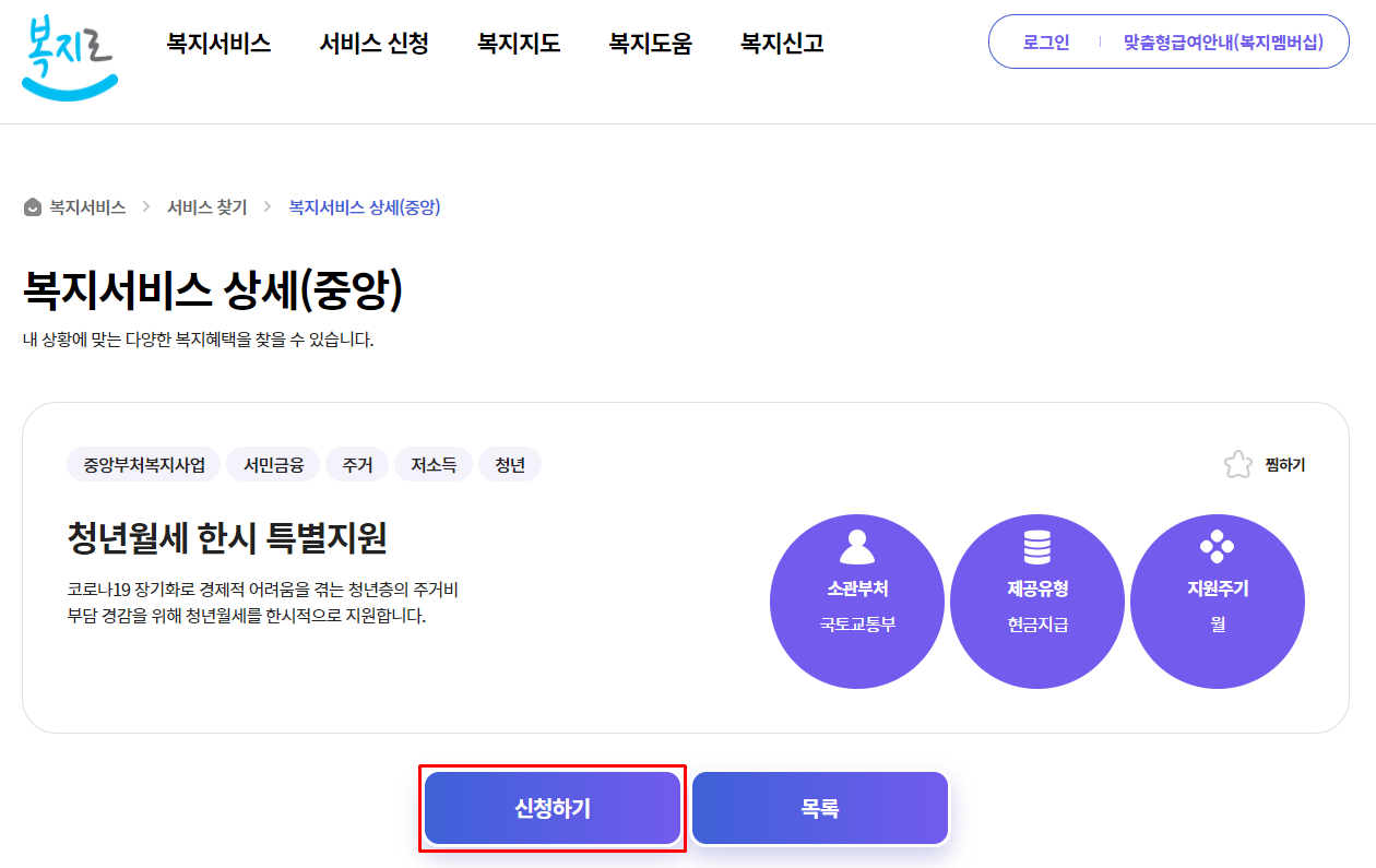 - 복지로 로그인 > 서비스 신청 > 복지서비스 신청 > 복지급여 신청 > 기타 > 청년월세 한시 특별지원