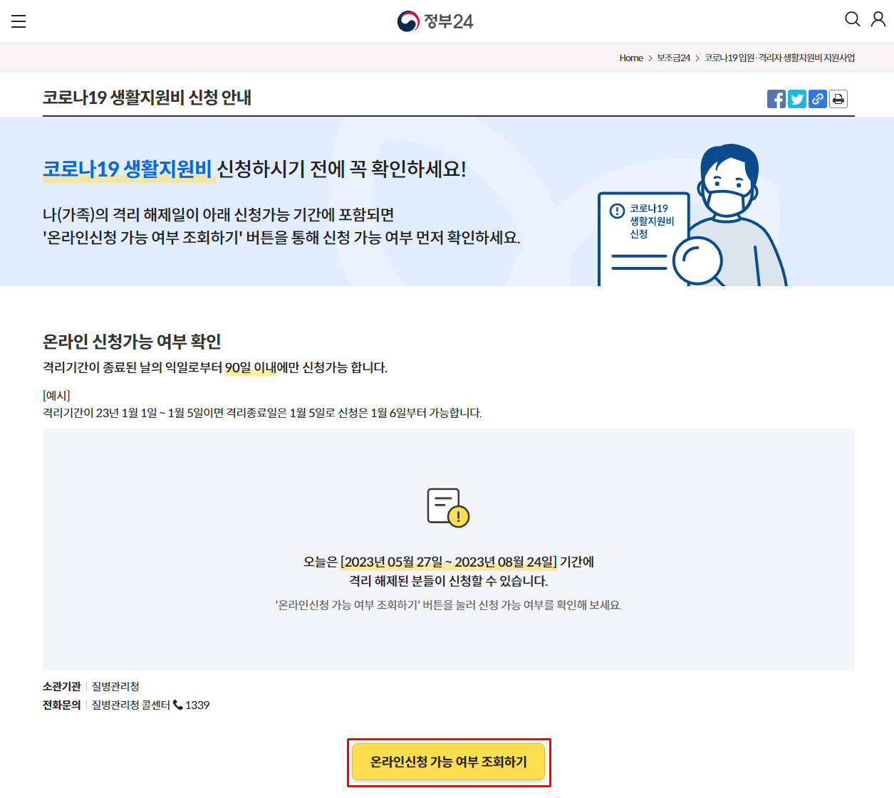 Step1 우선 [온라인신청 가능 여부 조회하기] 버튼을 클릭하여 신청가능 여부를 확인합니다.