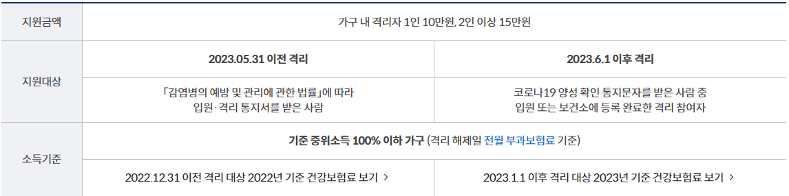 생활지원비 지원대상은 기준 중위소득 100%이하이면서 코로나19 양성 확인 통지문자를 받은 사람 중 입원자 또는 보건소에 등록완료한 격리 참여자입니다.