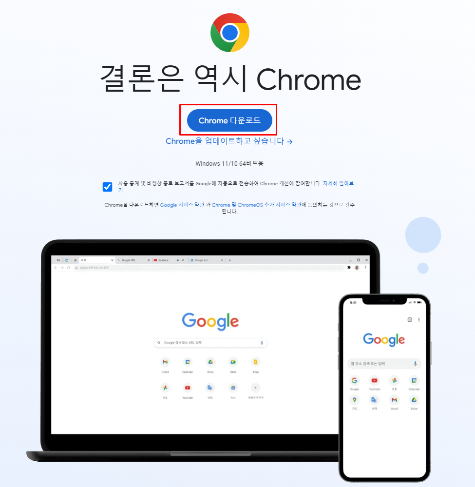 - 크롬 다운로드를 클릭하여 다운로드 받습니다.