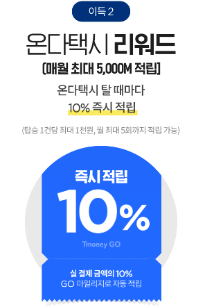 - 매월 최대 5,000M 적립이 가능하며, 온다택시 탈 때마다 10% 즉시 적립됩니다. (탑승 1건당 최대 1천원, 월 최대 5회까지적립가능합니다.)