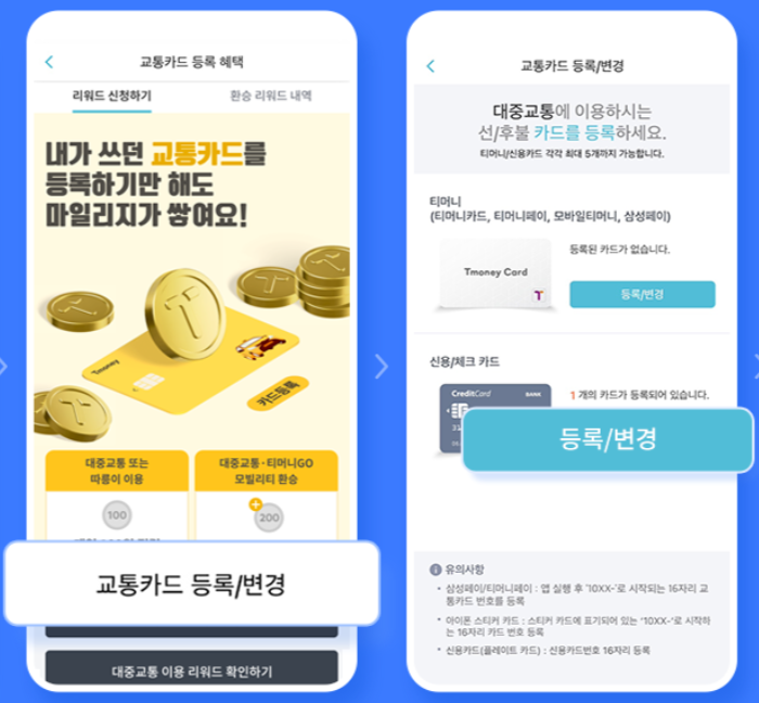 Step3 [교통카드 등록/변경] 을 터치합니다. 그리고 [등록/변경] 을 터치합니다.