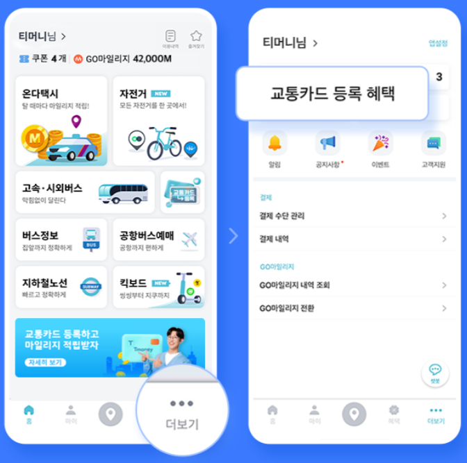 Step2 티머니고 앱에서 우측하단 [더보기...] 를 터치합니다. 그리고 [교통카드 등록 혜택] 을 터치합니다.