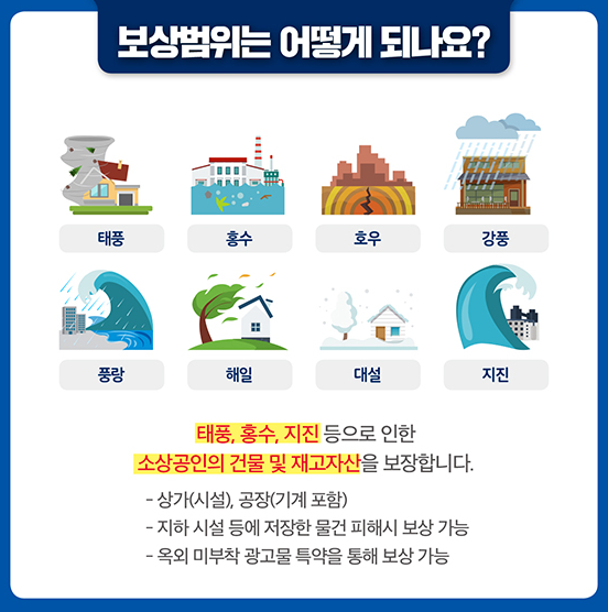 - 보상범위는 태풍, 홍수, 지진 등으로 인한 소상공인의 건물 및 재고자산을 보장합니다.