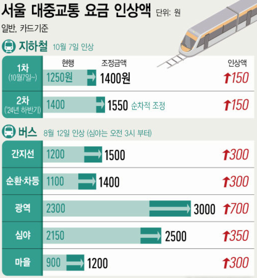 버스는 8월 12일부터 300원 인상되고, 지하철은 10월 7일부터 150원 인상된다고 합니다.