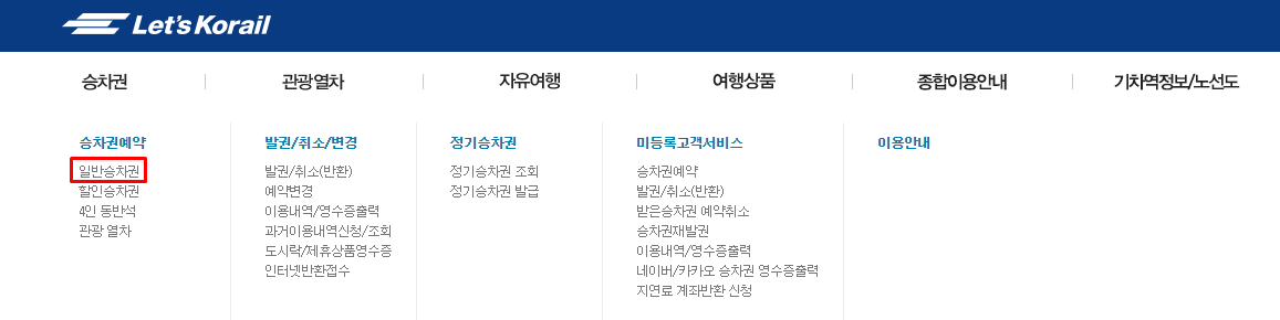 Step1 코레일 홈페이지에 접속한 후 [승차권 > 승차권예약 > 일반승차권] 메뉴로 들어갑니다.