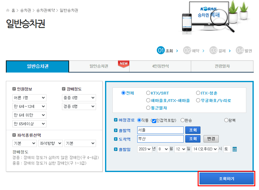 Step2 일반승차권페이지에서 기차 종류, 출발역, 도착열, 출발일을 입력한 후 [조회하기] 를 클릭합니다.
